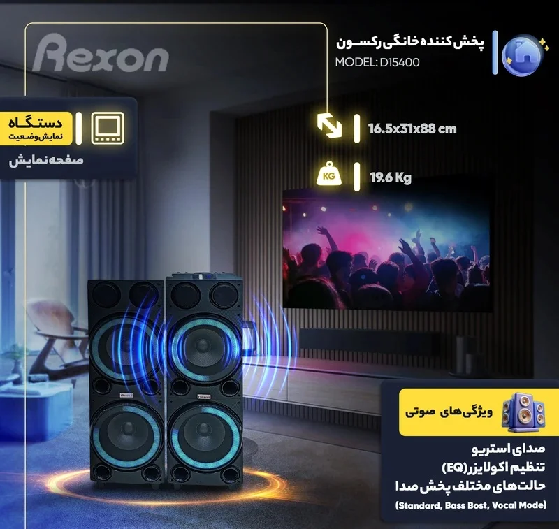 فرض کن یک دورهمی راه انداختی، موسیقی پخش میکنی و از همون ثانیه اول به این نتیجه میرسی که صدای گوشی یا حتی اسپیکرهای معمولی جواب نمیده. اینجا دقیقاً جاییه که اسپيکر رکسون مدل HT-D15400 خودش رو ثابت میکنه؛ یک سیستم صوتی قدرتمند، قابلاعتماد و مناسب هر جایی که نیاز به صدا—واقعا صدا—داشته باشی.